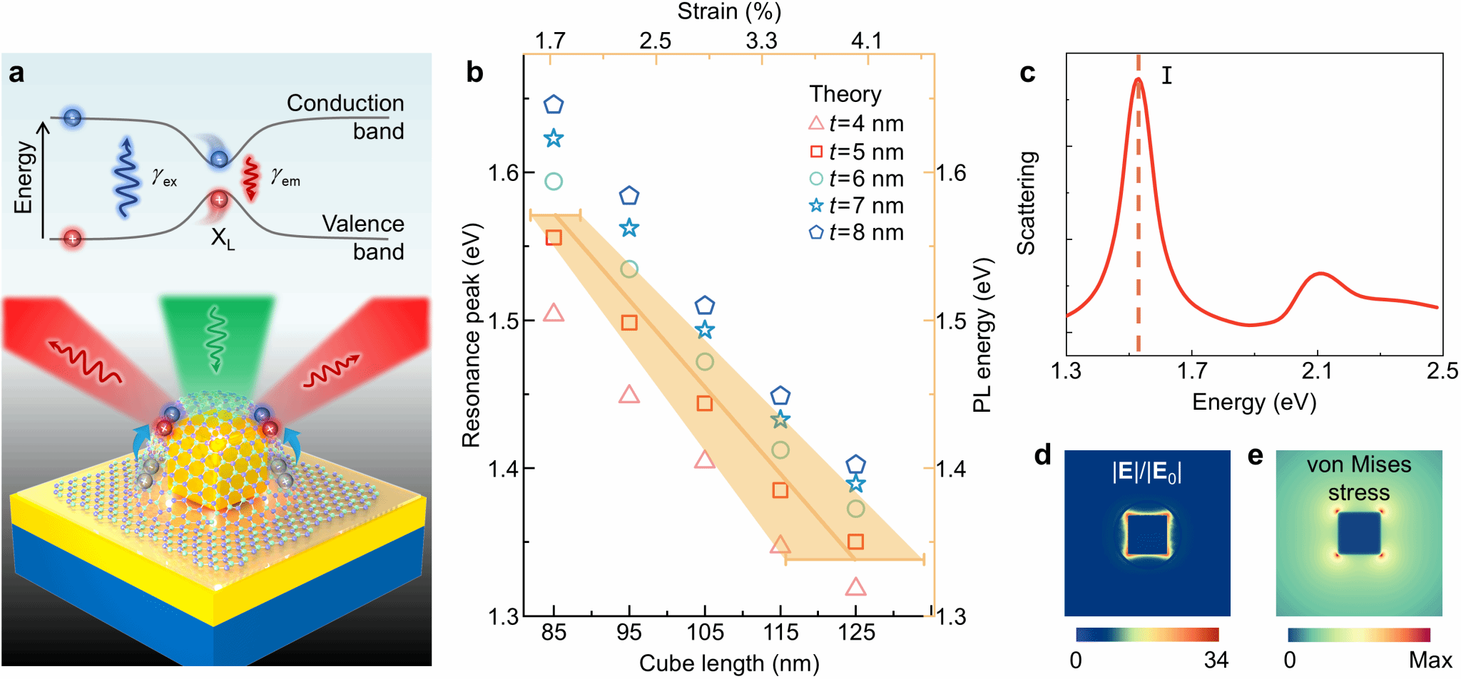 二维过渡金属硫族化合物(TMDs)中的激子及多体束缚态在光与物质相互作用中发挥着重要作用,并在光电子与量子光学器件领域展现出广阔的应用前景。其中,由缺陷、无序或应变诱导形成的局域激子因其较长的辐射寿命、稳健的自旋-能谷耦合特性以及较高的光子提取效率,被认为是构建片上单光子源的理想候选。然而,现有局域激子的激发与调控多依赖低温条件或复杂器件结构,难以满足高密度片上集成的需求。近年来,研究者通过金属或介质纳米结构在单层TMDs中引入稳定应变,实现了局域激子的有效激发。然而,为抑制热涨落影响,确保器件在室温下稳定运行,仍亟需进一步实现激子发射能量的红移调控。其核心挑战在于如何协同匹配应变诱导势阱深度与等离激元共振能量,否则局域激子发射易被自由激子背景淹没或因强度过低而难以探测。因此,在实现宽波段可调的同时保持高发光亮度,仍是当前亟待解决的关键问题。