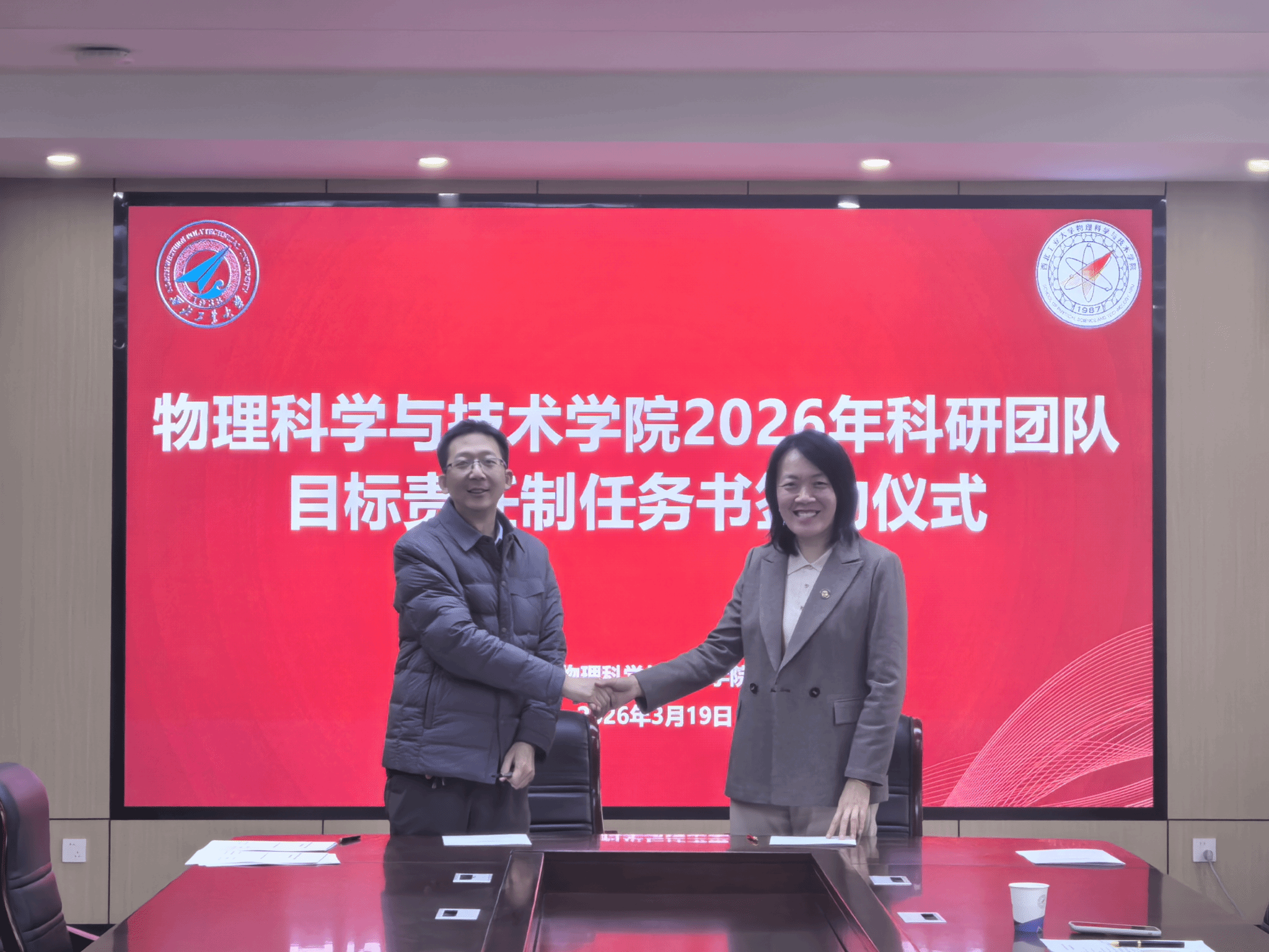 科研团队目标责任制管理办法》,对各个团队2026年度的科研和师资队伍建设任务指标进行解读,并代表学院分别与陕西省光信息技术团队、超声科学与技术团队和光基物质科学与超快过程团队负责人现场签订任务书。