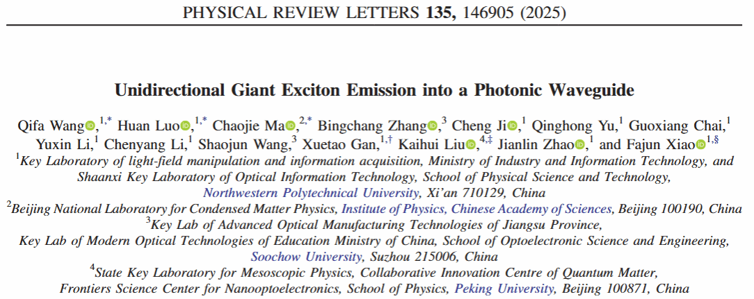 赵建林教授团队联合北京大学刘开辉教授、中国科学院物理研究所马超杰副研究员和苏州大学张丙昌、王绍军教授,在物理学领域顶级期刊《Physical Review Letters》上发表了题为“Unidirectional Giant Exciton Emission into a Photonic Waveguide”的研究论文。探花约炮